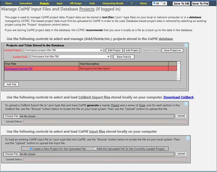 Click the “Save” button to return to the project page and it should look like below. As indicated in the screen shot, CalME has created a new Project along with an "Trial" using the names given in the dialog above.