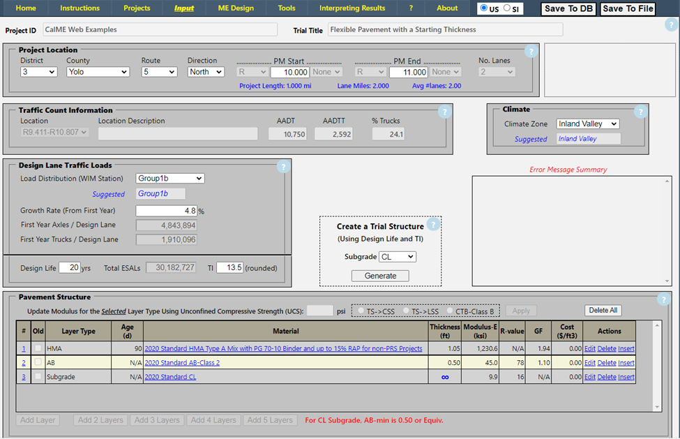 The traffic suggested by CalME for 20 year design life is 12.7 for this location. After changing this to the 13.5, and choose "CL" in the “Create a Trial Structure” box, then click on the Generate button, the input page looks like below: