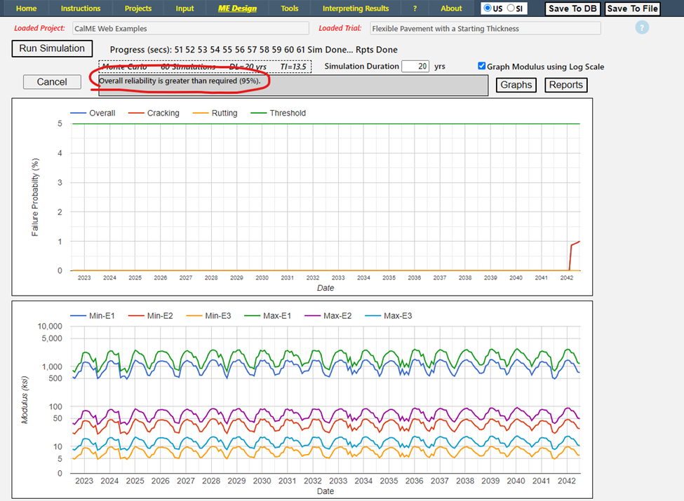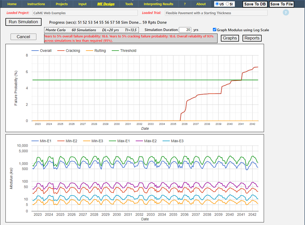 Use the “ME Design” tab to navigate to the simulation window. Use the “Run Simulation” button at the upper left part of the screen to run CalME. The simulations will run in the background. The cracking/rutting chart and stiffness chart will update in real time as the simulations are running. The Layer Compression and Expected Life summaries will be generated after the simulations are completed. The result is shown below: