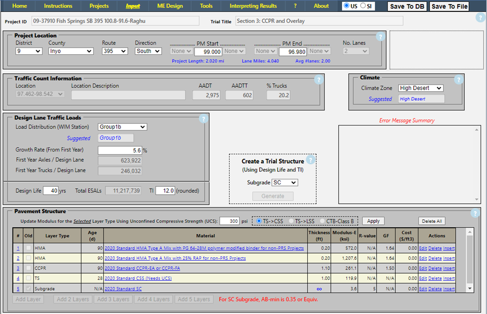 To evaluate this option, save a copy of the baseline trial for Section 3 as “Section 3: CCPR and CSS”. After removing the existing HMA and AB layer, and adding the new layers, the project inputs are shown below: