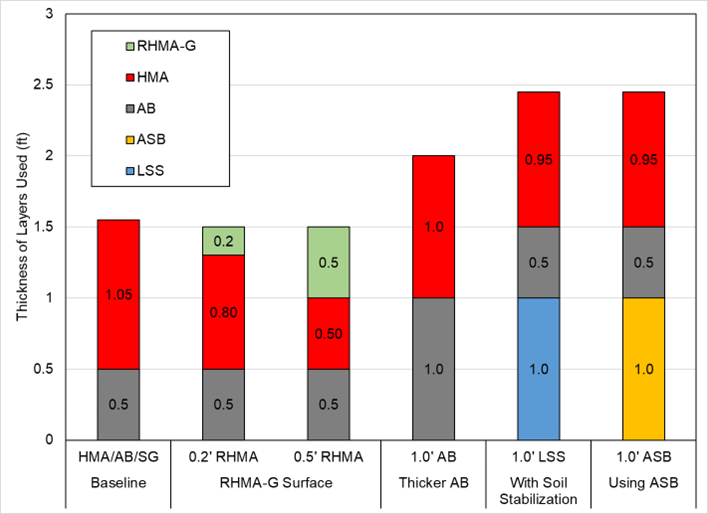 A comparison of the optimal designs for different alternatives is shown in the figure below. This is generated in Excel after collecting all optimal designs. These designs can then be further evaluated in LCCA for cost effectiveness and LCA for sustainability.