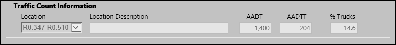 The first set of controls, shown below, consists of several readonly fields that are used to report Caltrans traffic counts at the center point in the project limits. They are populated by CalME once the pavement project has been located on a route.