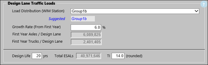 Selecting a value for the WIM group sets the values for the other data items in the Design Lane Traffic Loads section. When you make a change to one of the editable fields, CalME will then recompute the other dependent values. For example, changing the TI will change: First Year Axles / Design Lane, First Year Trucks / Design Lane and Total ESALs; the WIM group and a Growth Rate are not modified. Also, changing the Growth Rate with change First Year Axles / Design Lane, First Year Trucks / Design Lane and TI.