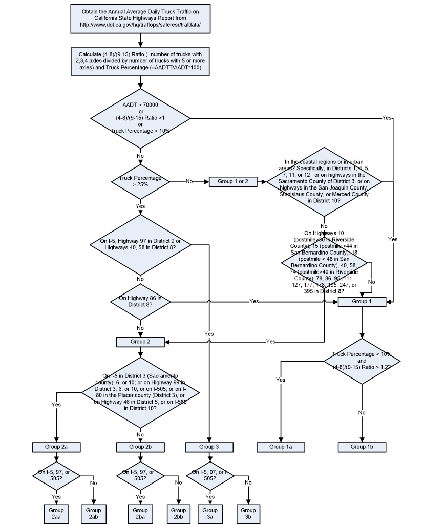 An analysis of the load distribution data (Grouping of WIM Sites Based on Axle Load Spectra) showed that the load distributions fall into eight groups. The decision tree used to determine the group is shown below and in "corrected_flowchart".