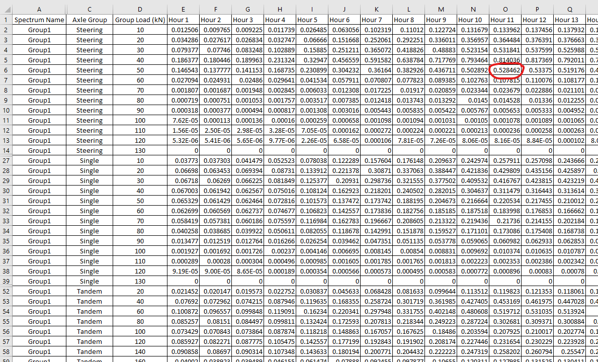 In CalME, truck traffic is distributed into the four axle groups, the 24 hourly periods for each day, and various group load brackets. An example of how the load spectrum is defined is shown below for Group1. As shown in the example, 0.528462% of the daily traffic comes in the form of 50kN steering axle group. Note that the load shown below is for the whole axle group. A group load of 80 kN for a tandem axle corresponds to a 20 kN load for each of the four dual hubs in the axle group.