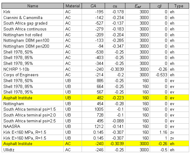 The default criteria are the Asphalt Institute criteria (highlighted in the table). For AC the default Asphalt Institute criterion assumes a volume percent binder of 11 and an air voids percent of 5. The program has an option for modifying the Asphalt Institute criterion to other values of volume percent binder and air voids percent.