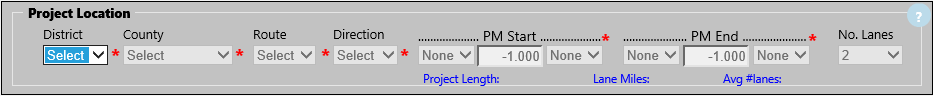 The following controls, located on the Input -> Project Information Page, are used to specify the location of the pavement project on a route in California.