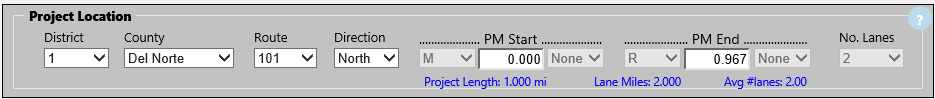 After you select North for Direction, CalME will generate a Start PM of "M0.000" and a End PM of "R0.967". These PM selections are for the start of Route 101 North in Del Norte county, and the PM associated with a project length of 1.0 miles. The blue text shown below the Start and End PMs shows the length of the project (1.0 miles), the lane miles (2.000) and the average number of lanes for the length of the project (2.00). CalME also assigns a value for the number of lanes (2) at the center point of the project.