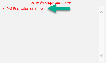 If the PM value entered by the user (e.g., 100.000) is not valid, a message in the Error Message Summary text box will be generated.
