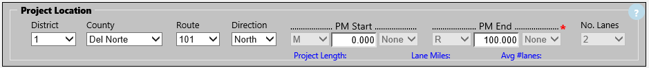 CalME assists with the selection of the starting and ending PMs for a new project by assigning the project Start to be the PM of the beginning of the route and the project End to be the PM associated with a project length of 1.0 mile, after a selection for Direction is made. Shown below is what you will see when you select Route 101 North, in Del Norte county.