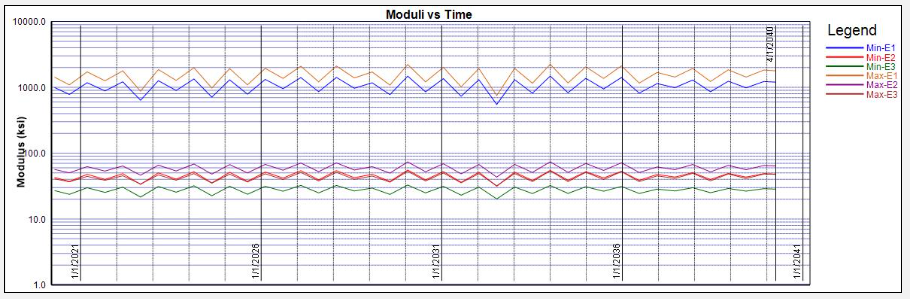 The modulus graph shows the layer moduli vs. Time for each simulation. You can also select to see the variation with Axles or ESALs using the radio buttons in the upper right of the page. You can see the variation in modulus using Log scale or arithmetic (linear) scale. When viewing the variation in modulus in arithmetic scale, you can set the maximum value for the y-axis by selecting the "Set Ymax" check box and specifying a value in the text box and the selecting the Modulus button.