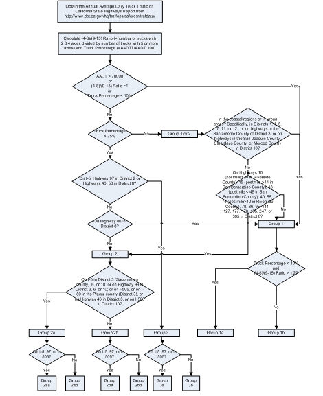 The load distributions are derived from Weigh-In-Motion (WIM) stations at more than 100 locations in California (Truck Traffic Analysis using Weigh-In-Motion (WIM) Data in California). An analysis of the load distribution data (Grouping of WIM Sites Based on Axle Load Spectra) showed that the load distributions fall into eight groups. The decision tree used to determine the group is shown below and in "corrected_flowchart".