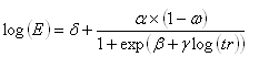 The intact modulus, Ei, corresponds to a damage, ω, of 0 and the minimum modulus, Emin=10δ, to a damage of 1.
