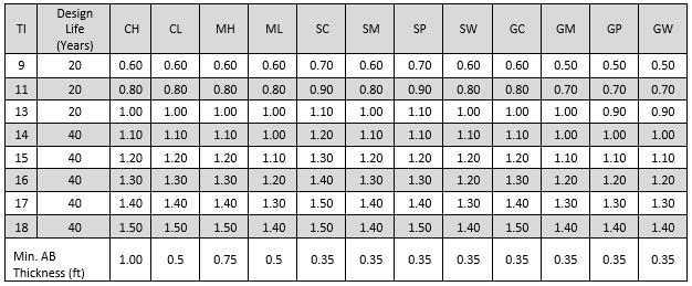 Table 1: Starting Point for Design of HMA Thicknesses (ft) with Minimum AB Thickness for