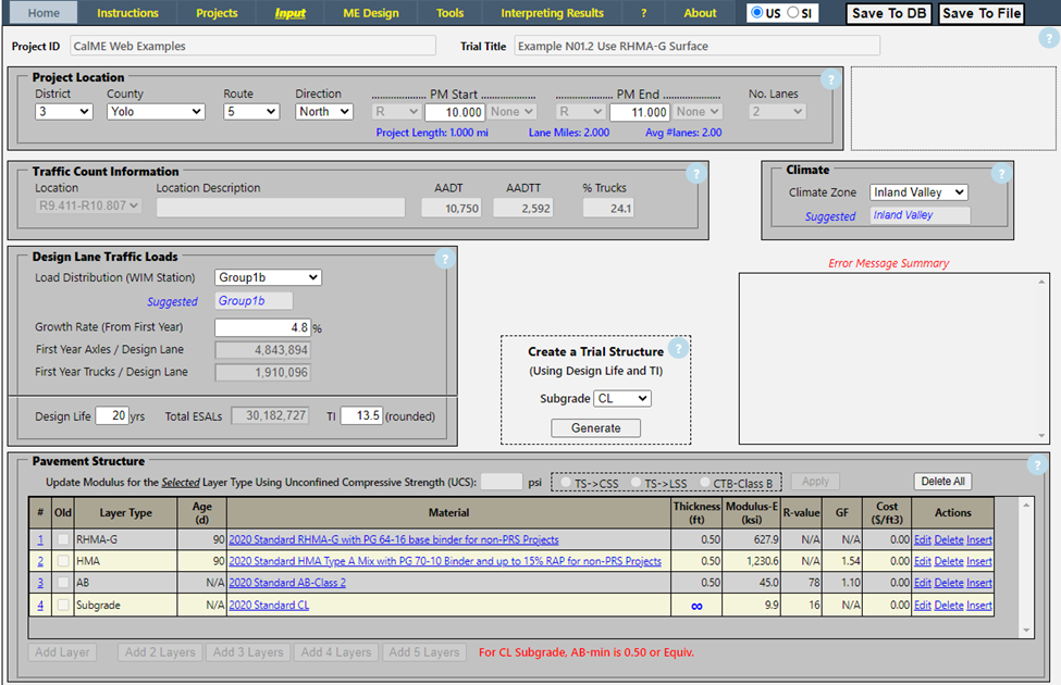 To evaluate this alternative, save the original trial under a new name "Example N01.2 Use RHMA-G Surface". Use the "Insert" link for layer 1 to add a layer on top of the HMA and pick "RHMA-G" from the "Layer Type" drop down list. There is only one RHMA-G mix available at this time.