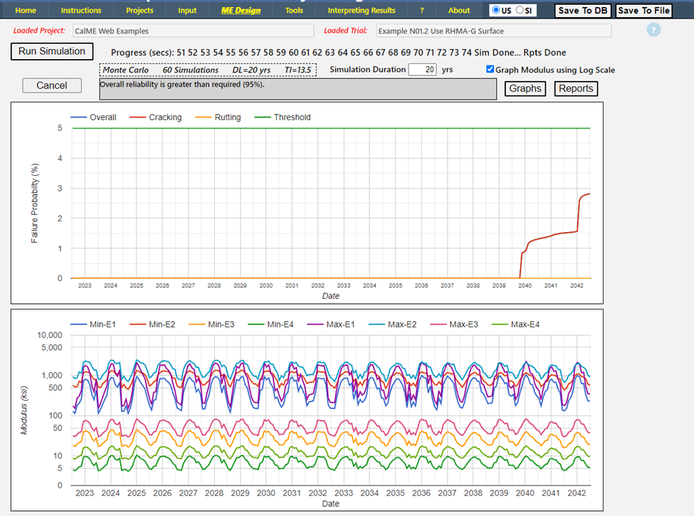 After running some Monte Carlo simulations, the required thickness combinations are determined and shown below in Table 1. As shown in the table, using 0.20 to 0.50 ft of RHMA-G reduces the combined thickness for asphalt bound layer by 0.05 ft. In other words, the HMA can be replaced with RHMA-G at roughly 1:1 ratio up to 0.50 ft.