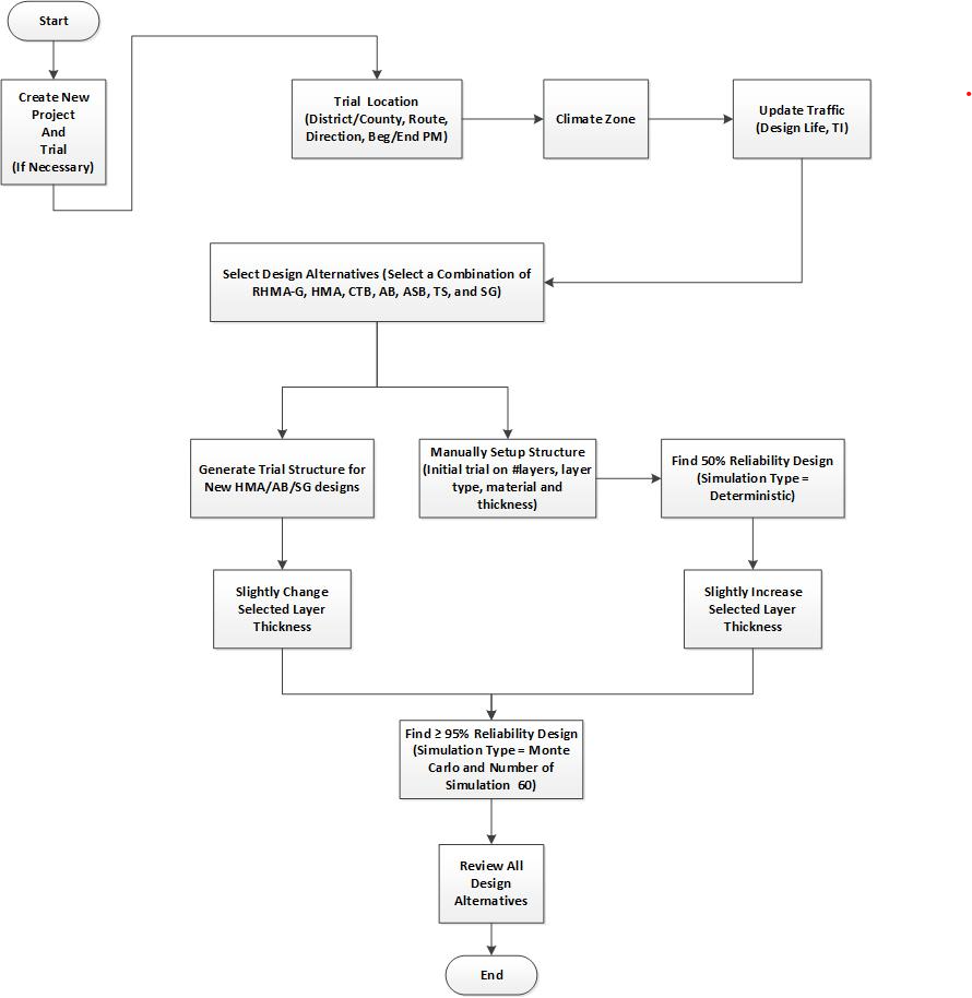 The flowchart shown below is a very high-level view of the design process for new construction and does not include the many administrative, engineering and policy related details that are associated with a pavement design.