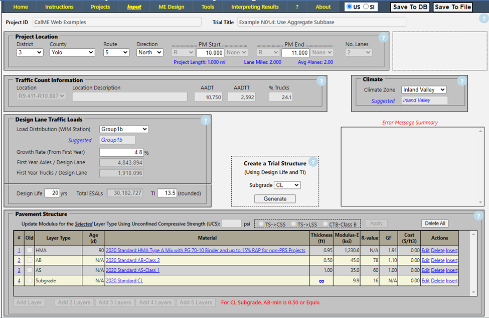In this subsection, the alternative of introducing an aggregate subbase before placing aggregate base is examined. Specifically, an AS-Class 1 layer of 1.0 ft thick is placed between AB and SG. The HMA thickness required is expected to be reduced.