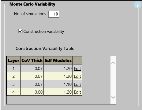 In Monte Carlo mode, many simulations are performed on the pavement structure using random values from a distribution of values for several input data items, such as thickness and and modulus. The number of simulations is specified below. Monte Carlo takes into account within project construction variability.