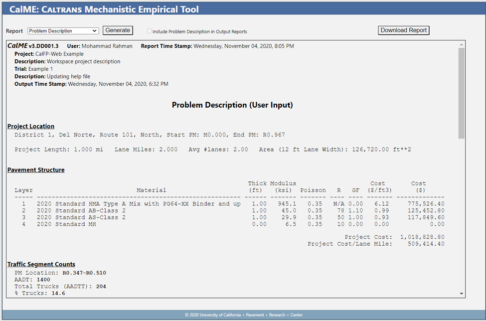This report has a section for each input area, such as Location, Pavement Structure and Monte Carlo Variability.