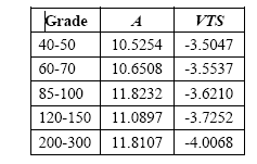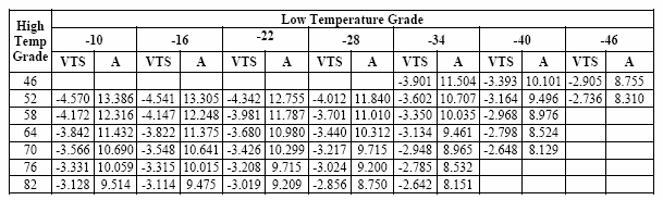 Examples of the viscosity parameters are shown below, given for temperature in ēR (A ēK = A ēR + VTS×log(9/5)). A given mix modulus versus temperature relationship can, however, be fitted quite well with a number of different viscosity versus temperature relationships.
