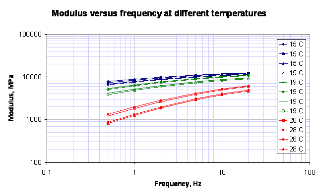 The figure below shows the results of frequency sweep tests done at three different temperatures (15, 19 and 28 oC)