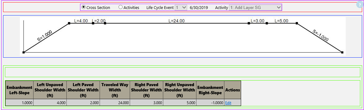 The graphic above is showing the cross section for event 2 (occurring on 1/1/2020) and activity 3 (adding an HMA layer). eLCAP also shows the computed cross sectional area (14.5 ft2) and the volume (76,560.0 ft3) for the selected event and activity. This volume, along with the material density, is used to compute quantity of material.
