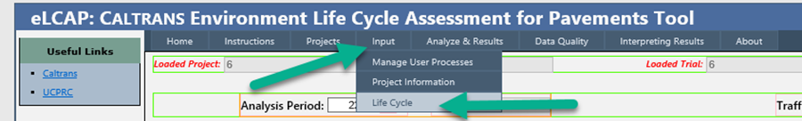 When an activity is defined and saved, eLCAP will generate a default material to be used (e.g., a specific kind of HMA when adding an HMA layer) and a list of the construction equipment necessary to implement the activity. eLCAP will also compute the quantities of material using the project limits (post mile start/end and number of lanes), the cross section defined on the Project Information page, and the thickness (add layer or remove material) specified for the activity. eLCAP will also provide time estimates for each piece of construction equipment. The default material and the computed material quantities and equipment time estimates may be edited.