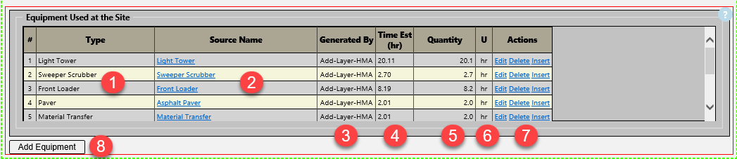 This page shows the eLCAP-generated pieces of equipment and times of operation for all activities for the selected event; it also allows a user to manually add and delete equipment.