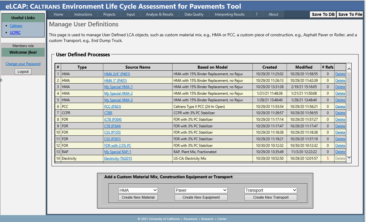 This page is used to create user or specialized version of library (built-in) material mixes (e.g., HMA, PCC), Equipment (e.g., Pavers, Rollers) and Transports. A user defined process is always based on an existing library process. Once you have created a user defined process, you can use any where a library process is used.