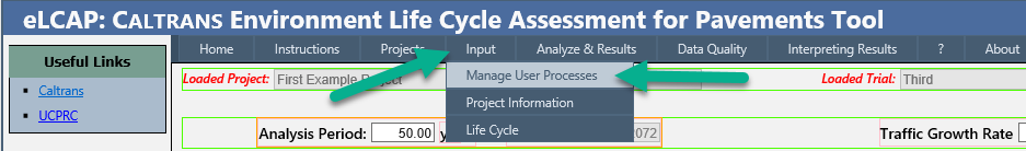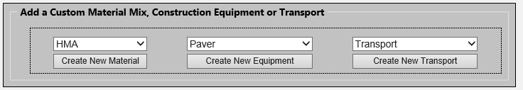 This page is used to create user or specialized version of library (built-in) material mixes (e.g., HMA, PCC), Equipment (e.g., Pavers, Rollers) and Transports. A user defined process is always based on an existing library process. Once you have created a user defined process, you can use any where a library process is used. There are separate controls to add a user defined Material, Equipment and Transport, as shown below.