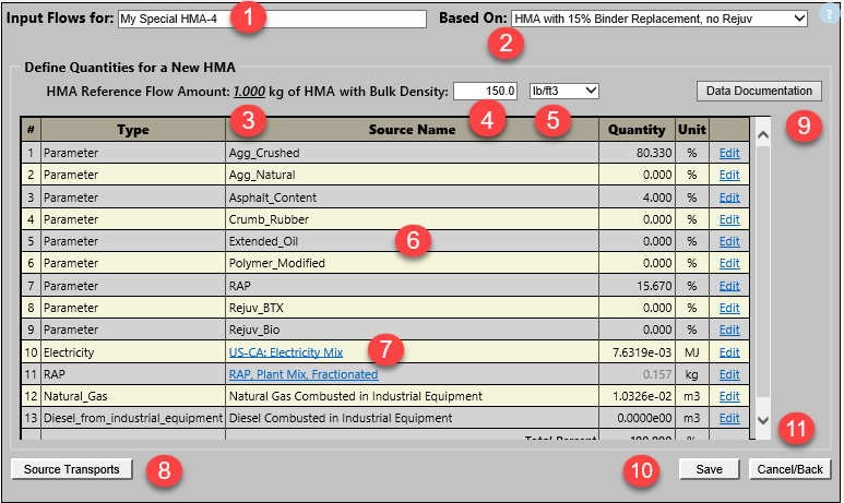 7.When the "Source Name" string is a hyperlink (shown in blue), you may (1) select it to see the parameters and flows that go into producing 1 unit of the selected link's product and (2) select another library or user defined mix for the flow or create a new custom mix. This is shown below.