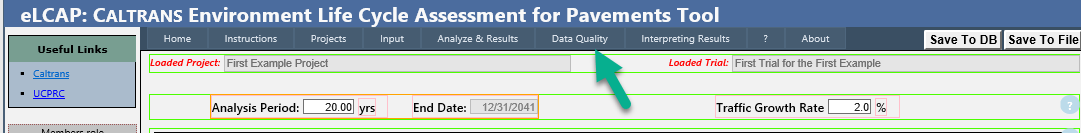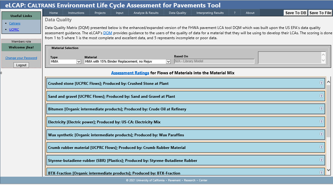 This page is shown by either selecting the Data Documentation button when viewing a library mix, or adding or editing a user defined material mix, or by selecting the "Data Quality" menu shown below.