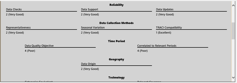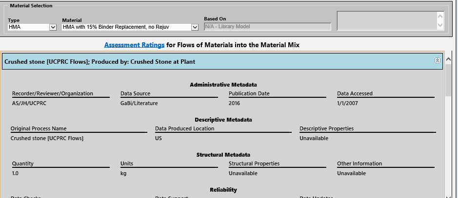 This page is shown by either selecting the Data Documentation button when viewing a library mix or adding or editing a user defined material mix, or by selecting the "Data Quality" menu shown below.