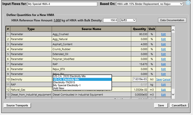 7.When the "Source Name" string is a hyperlink (shown in blue), you may (1) select it to see the parameters and flows that go into producing 1 unit of the selected link's product and (2) select another library or user defined mix for the flow or create a new custom mix. This is shown below.